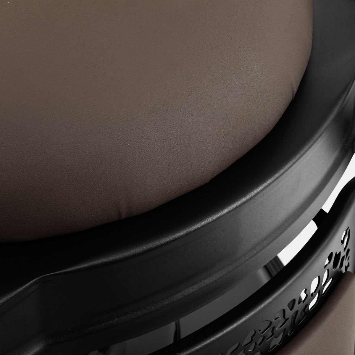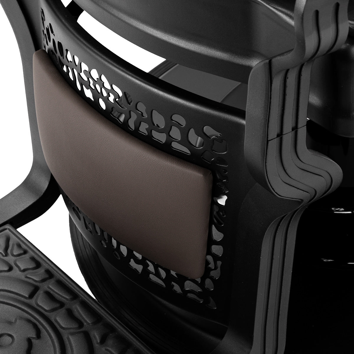 Uma construção sólida da base garante estabilidade e alto conforto de uso. O enchimento do assento feito de espuma durável e resistente à deformação e o estofamento em couro sintético agradável ao toque com acabamento mate garantem durabilidade a longo prazo e uso confortável do mobiliário. Os materiais utilizados também tornam o equipamento resistente à humidade, durável e fácil de limpar. A capa em tons de castanho, juntamente com o apoio para os pés decorado, confere-lhe um carácter único. A cadeira, com o seu design distintivo que remete para o estilo vintage, encaixa-se perfeitamente na atmosfera das barbearias, realçando a sua ambiência única.