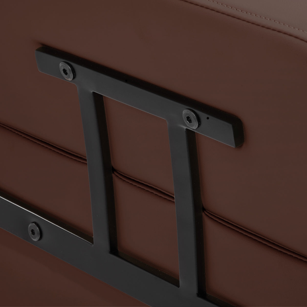 O mecanismo de rotação completa da cadeira torna o trabalho do cabeleireiro mais eficaz e confortável. Uma base sólida, plana e quadrada garante estabilidade durante a utilização. A superfície lisa com acabamento mate confere ao elemento um aspeto elegante e torna-o fácil de limpar. Um assento confortável com enchimento em espuma assegura alto conforto de utilização, mesmo durante muitas horas de tratamentos. Os apoios de braços geométricos em metal permitem o posicionamento correto dos ombros do cliente – isto significa que ele não enterra a cabeça nos ombros nem se curva – o que facilita muito a realização de tratamentos precisos, incluindo cortes de cabelo. Um elegante apoio para os pés dedicado a este modelo proporciona suporte estável para os pés do utilizador.