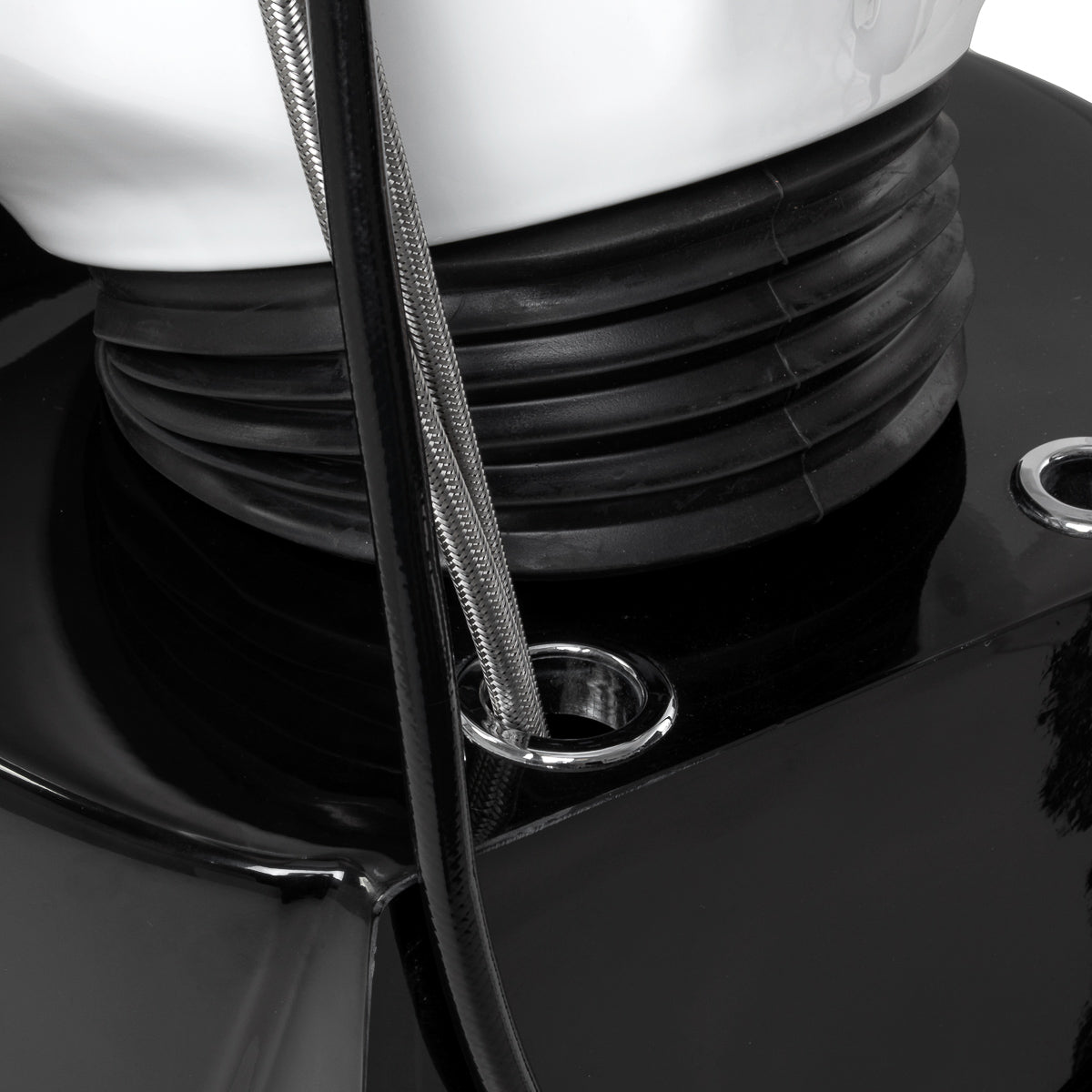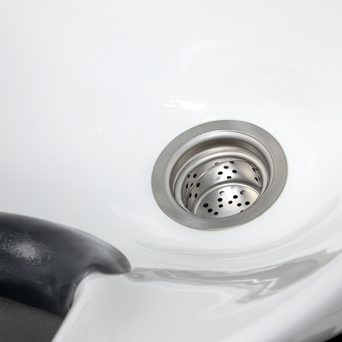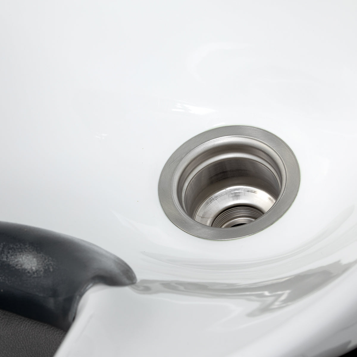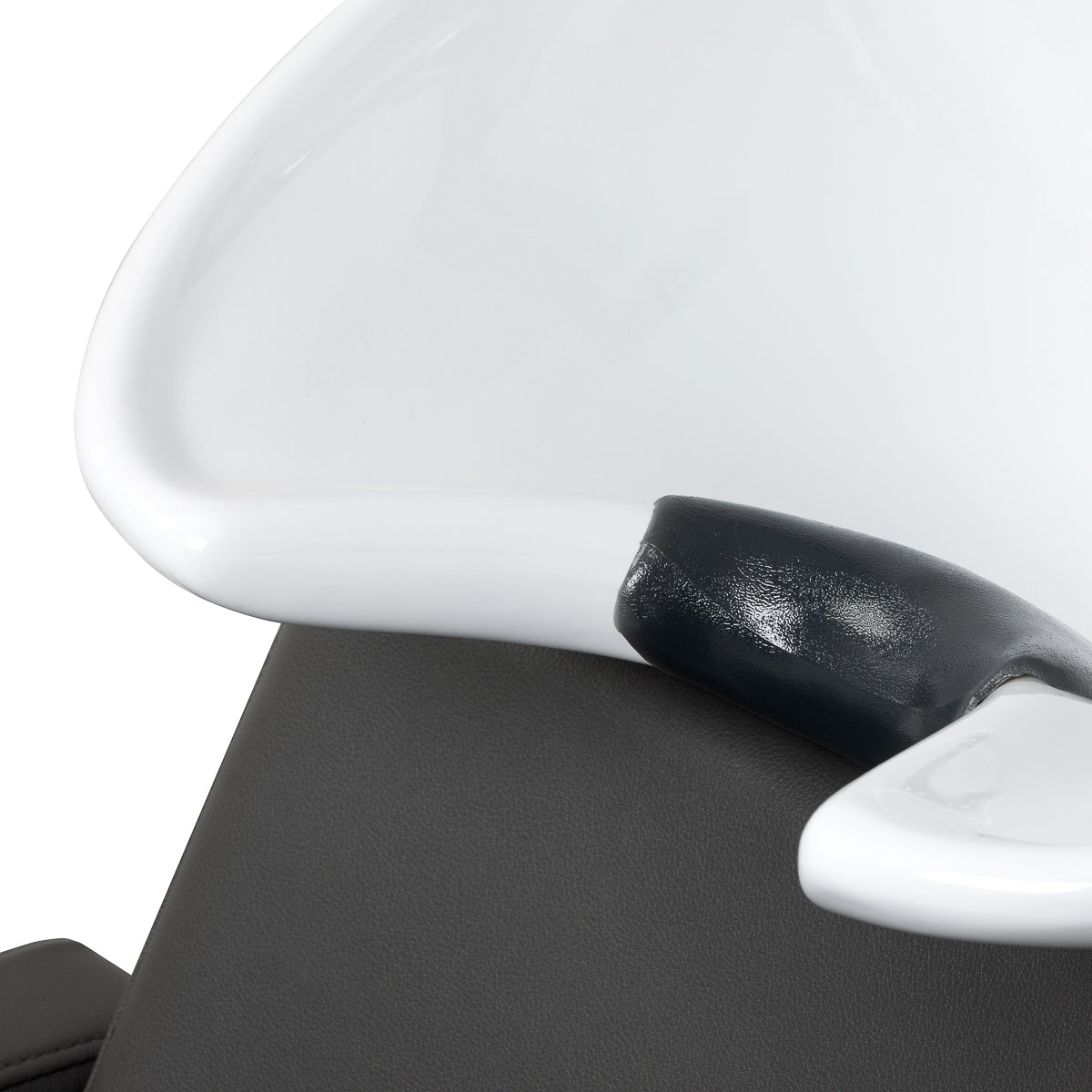 A taça cerâmica profunda em tons de branco reduz eficazmente os salpicos de água e preparações usadas durante os tratamentos. Isto promove a execução confortável e precisa de vários serviços de cabeleireiro. A construção móvel da taça permite um ajuste fácil do ângulo de inclinação às necessidades individuais. O material utilizado é durável, resistente a descolorações e riscos, e fácil de manter limpo. A gola devidamente perfilada proporciona suporte confortável para a cabeça durante a lavagem, enquanto a confortável cobertura de plástico em tons de preto elimina a sensação de frio da superfície cerâmica.