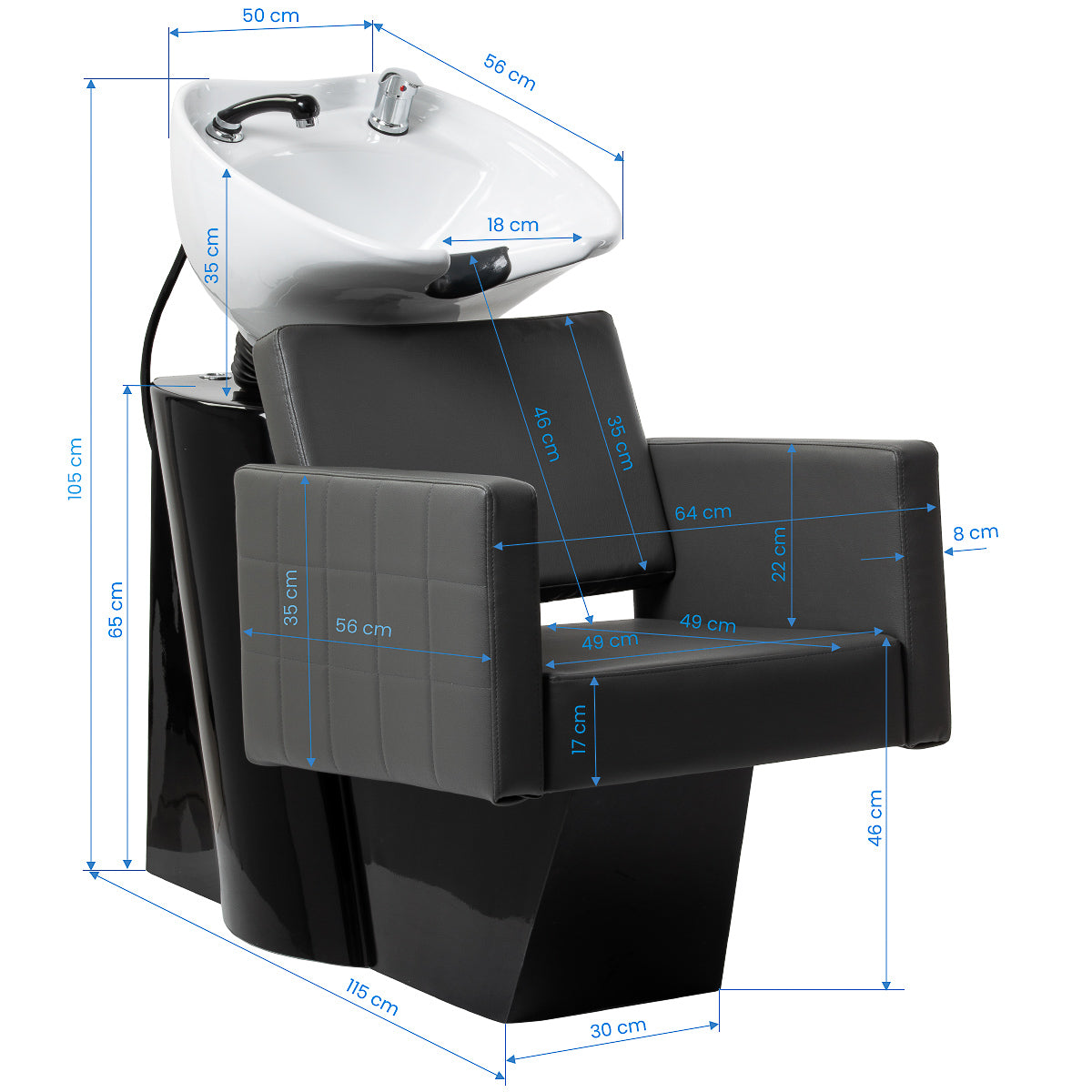 A elegante unidade de lavagem Ankara para cabeleireiro com uma cadeira de forma geométrica apoia a execução eficiente de tratamentos de cuidado e lavagem capilar. Foi concebida tendo em mente o equipamento funcional dos salões de cabeleireiro. O design integrado proporciona conforto tanto para o cabeleireiro como para o cliente, e o acabamento cuidadoso com costura lateral eficaz torna-a uma decoração para qualquer interior.