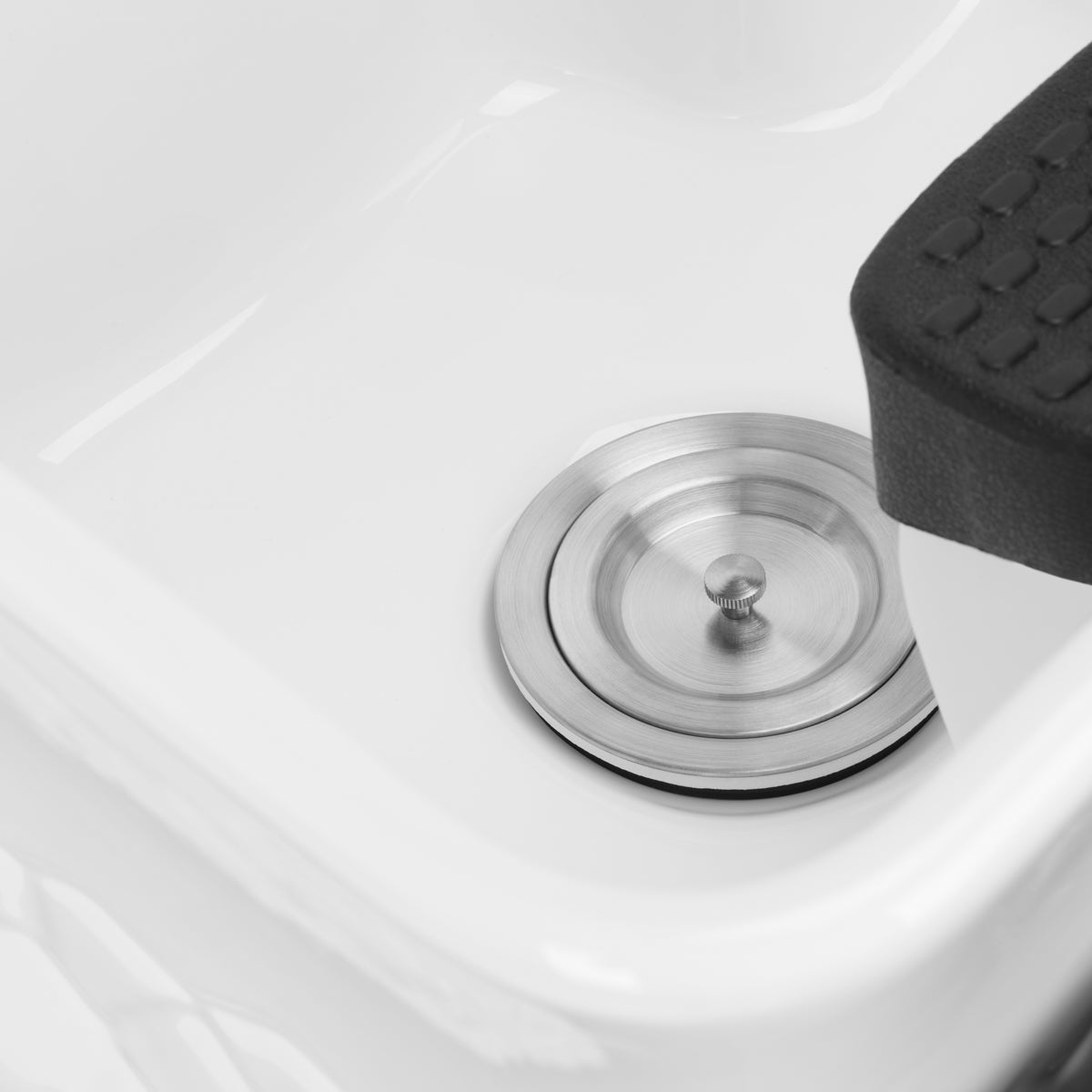 A moderna lavagem de cabelo Gabbiano para cabeleireiros combina funcionalidade com elegância italiana. A lavagem é feita com materiais da mais alta qualidade e acabamento perfeito. Sabemos o quão importante é o conforto do cliente durante os tratamentos, por isso o design especial oferece ao cliente um apoio sólido para a cabeça durante a lavagem. O assento macio e extremamente confortável é revestido com couro ecológico cinzento de alta qualidade. A lavagem possui uma bacia cerâmica branca e apoios de braços dourados. A peça de mobiliário perfeita para interiores modernos.