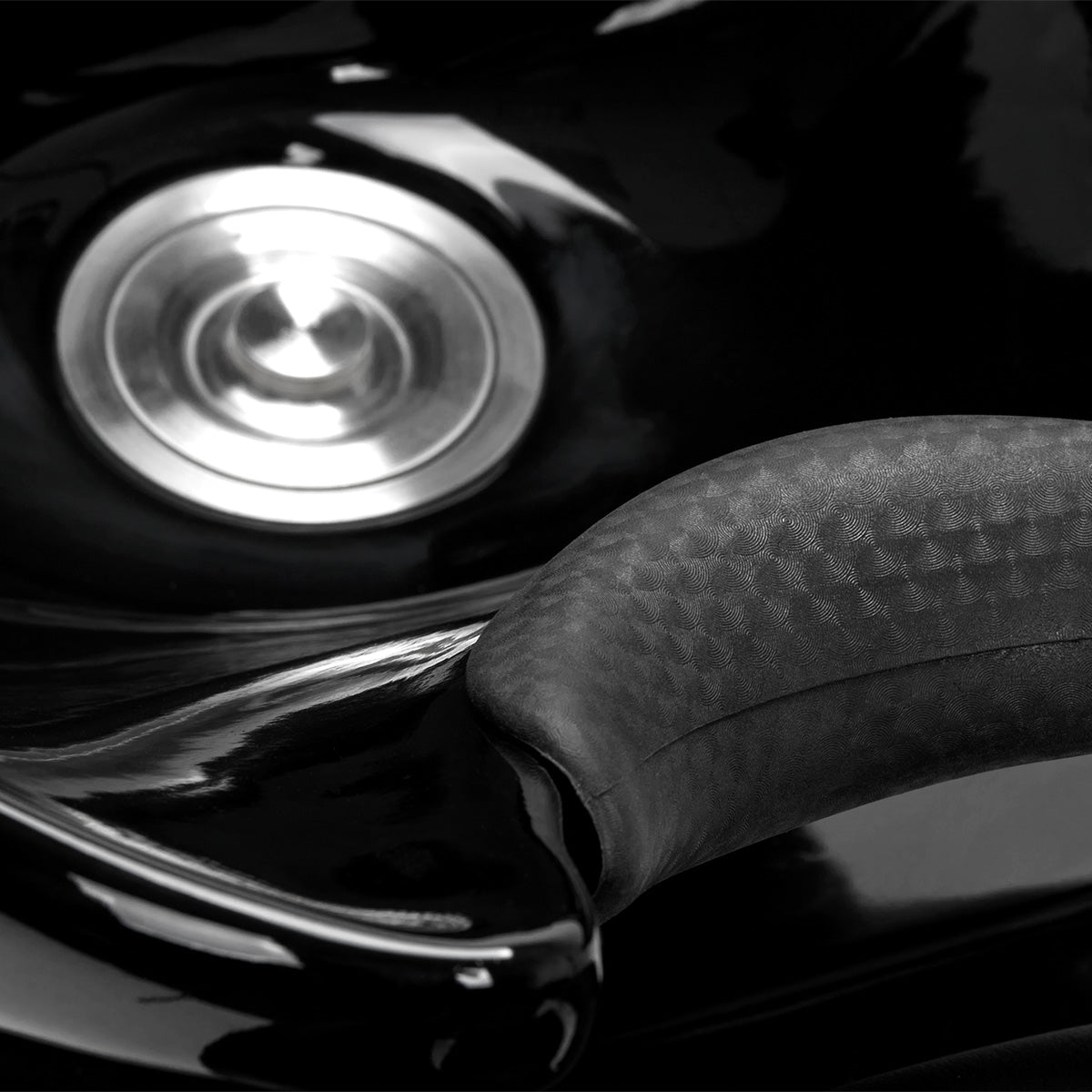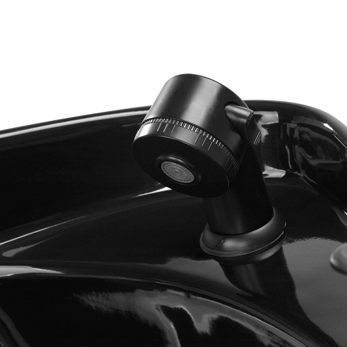 A taça da bacia cerâmica preta com a profundidade adequada evita salpicos excessivos de água e produtos usados durante o tratamento, permitindo a execução confortável de uma ampla gama de serviços. A capacidade de ajustar o ângulo da taça permite adaptar a configuração às necessidades individuais. O material utilizado torna a bacia durável, resistente a manchas e riscos, e muito fácil de limpar. Um colar devidamente perfilado proporciona suporte e conforto durante a lavagem do cabelo, e com a confortável cobertura plástica, o cliente não sentirá o desconforto associado à superfície fria da cerâmica.