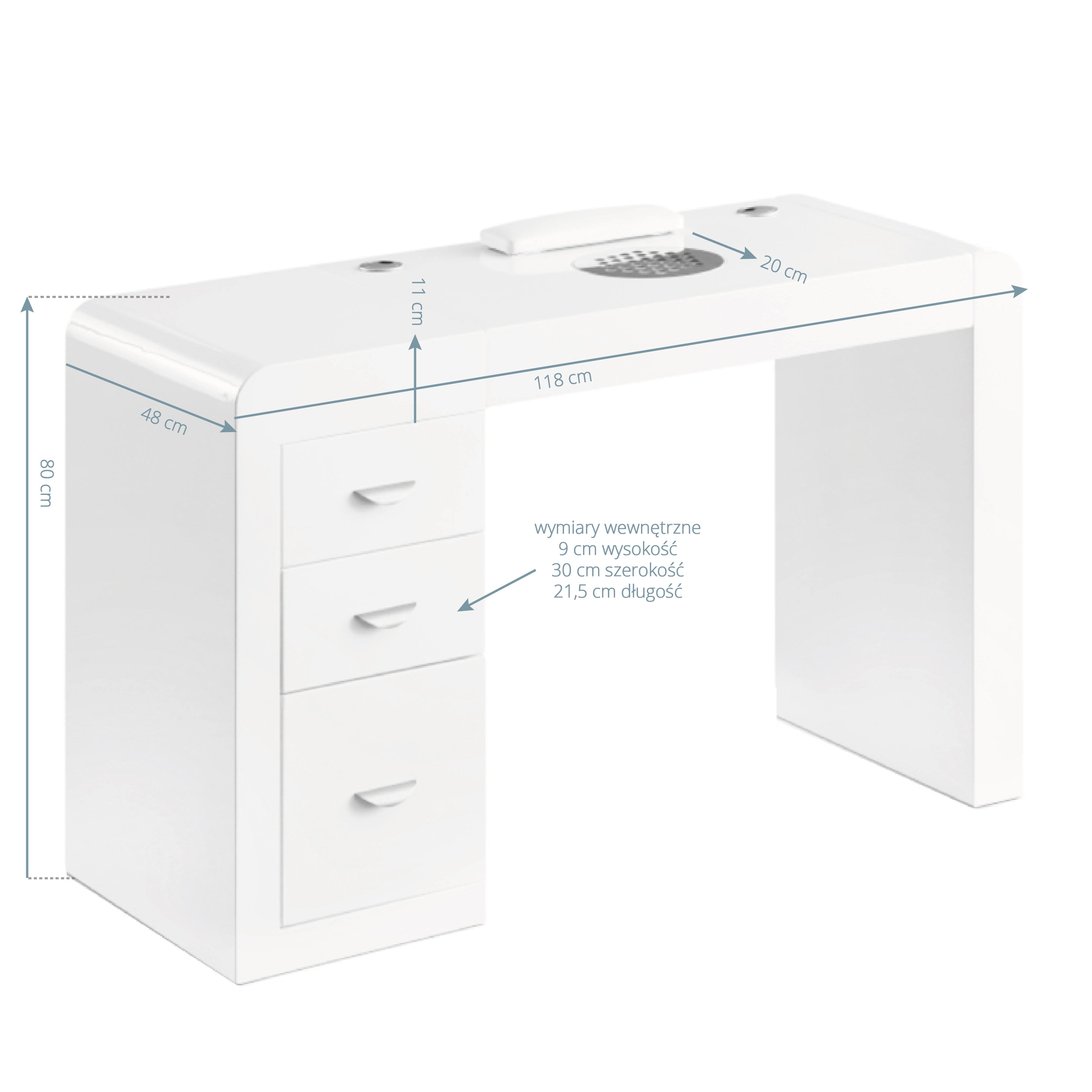 Três gavetas espaçosas facilitam a organização e a manutenção em ordem dos cosméticos e ferramentas mais necessários. A secretária está equipada com um absorvedor prático que reduz eficazmente a quantidade de pó nocivo, proporcionando ar limpo e fresco no local de trabalho. Ao mesmo tempo, graças à sua integração na superfície da secretária, não ocupa espaço de trabalho valioso. Locais especialmente concebidos para cabos facilitam a organização dos dispositivos necessários no salão, como máquinas de broca para unhas, lâmpadas de tratamento ou lâmpadas para unhas, permitindo esconder os cabos.