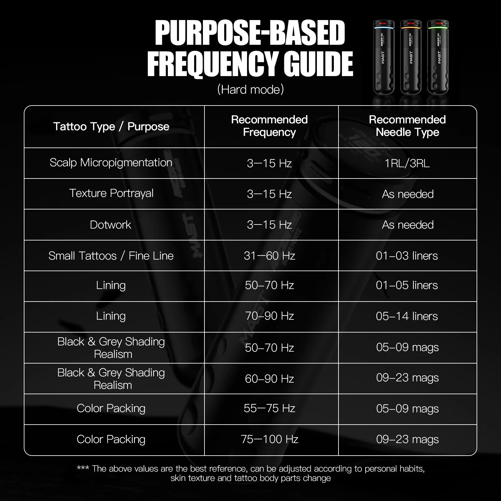 O curso de 4,2 mm proporciona golpes limpos e sólidos da agulha, ideais para contornos, sombreamento e preenchimento de cor – uma configuração confiável para profissionais que exigem rapidez e precisão. Alimentada por uma bateria de 1520mAh, oferece até 5 horas de funcionamento contínuo, e com a Base de Carregamento Ultra-Rápido Mast, pode carregar durante apenas 5 minutos para obter 1 hora de autonomia – ou atingir carga completa em menos de uma hora.