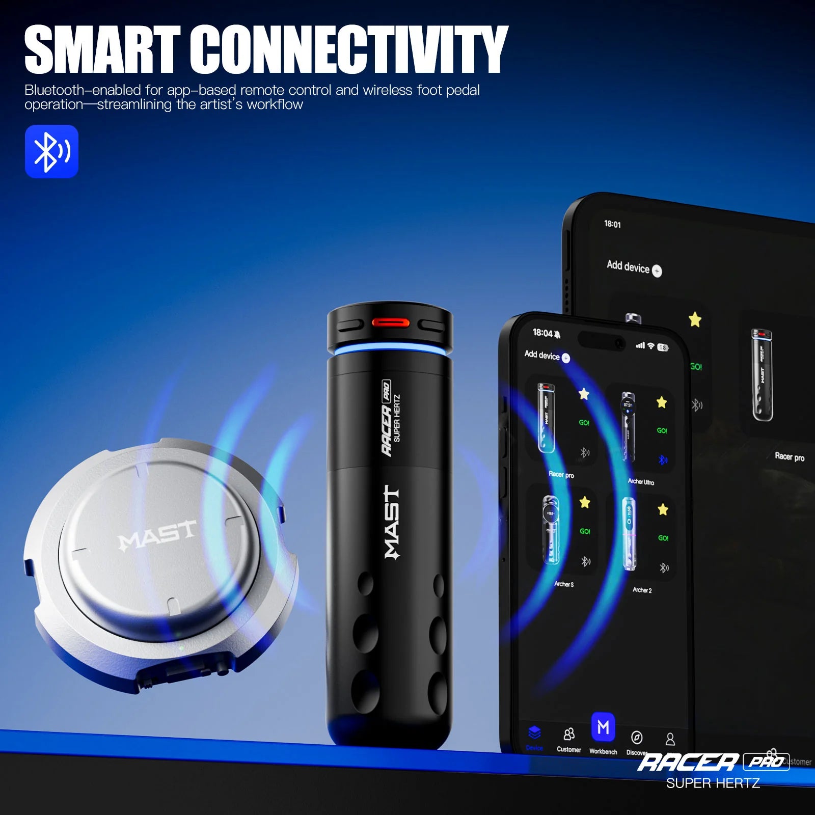 Equipado com conectividade Bluetooth, suporte para pedal de pé sem fios e um ecrã a cores HD cristalino de 0,85”, o Mast Racer Pro coloca o controlo total nas suas mãos – permitindo que se concentre na arte, não na configuração. Construído para durar, leve e desenhado para precisão, é o novo padrão das máquinas de tatuagem profissionais sem fios.