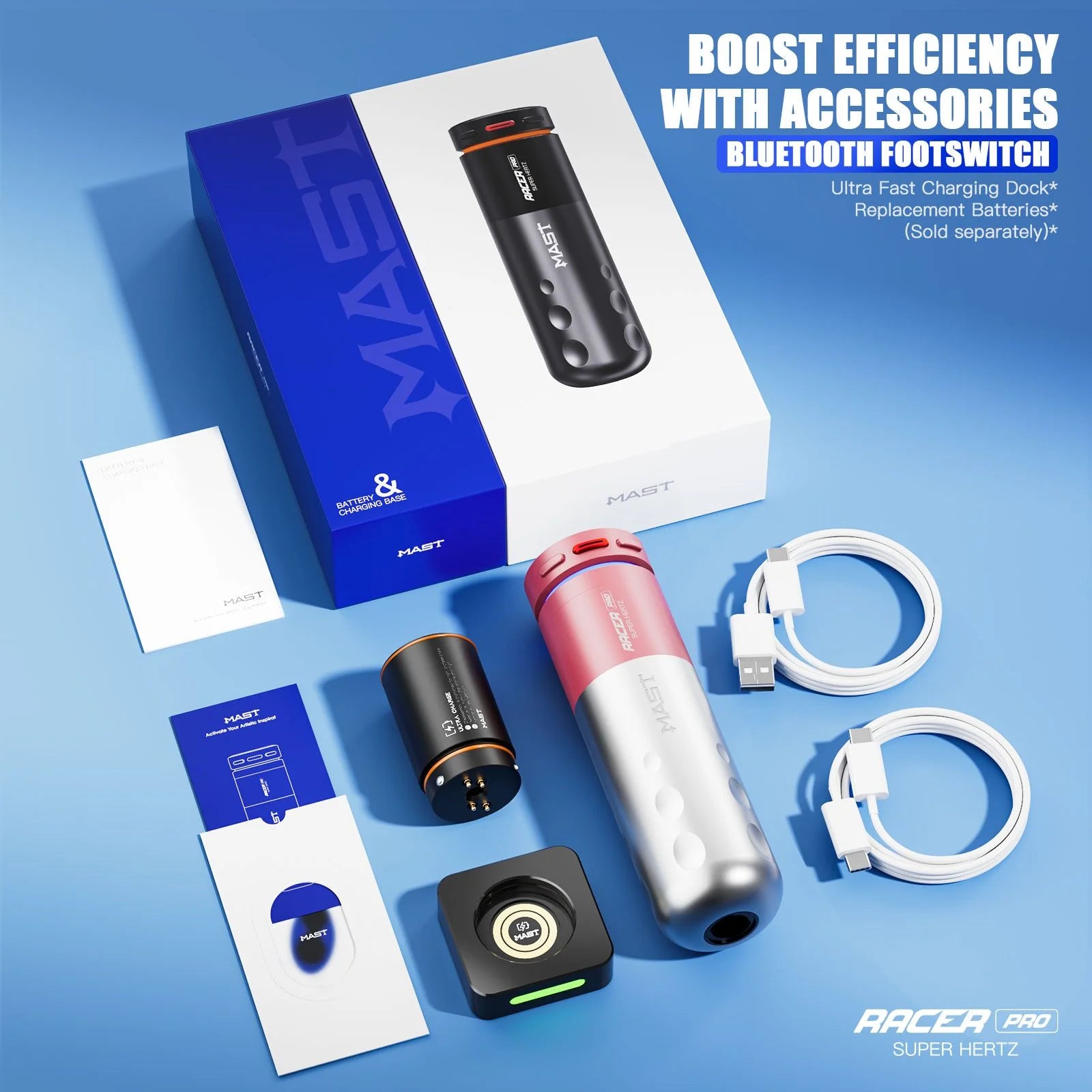Atualizada em relação à Mast Racer original, a versão Pro apresenta o avançado Motor MCORE Pro, que oferece um desempenho mais suave e potência perfeitamente estável para todos os estilos de tatuagem – desde traços finos e nítidos até saturação de cor intensa. O seu design inteligente integra a bateria diretamente na pega, criando um equilíbrio perfeito e reduzindo a fadiga no pulso durante longas horas de trabalho.