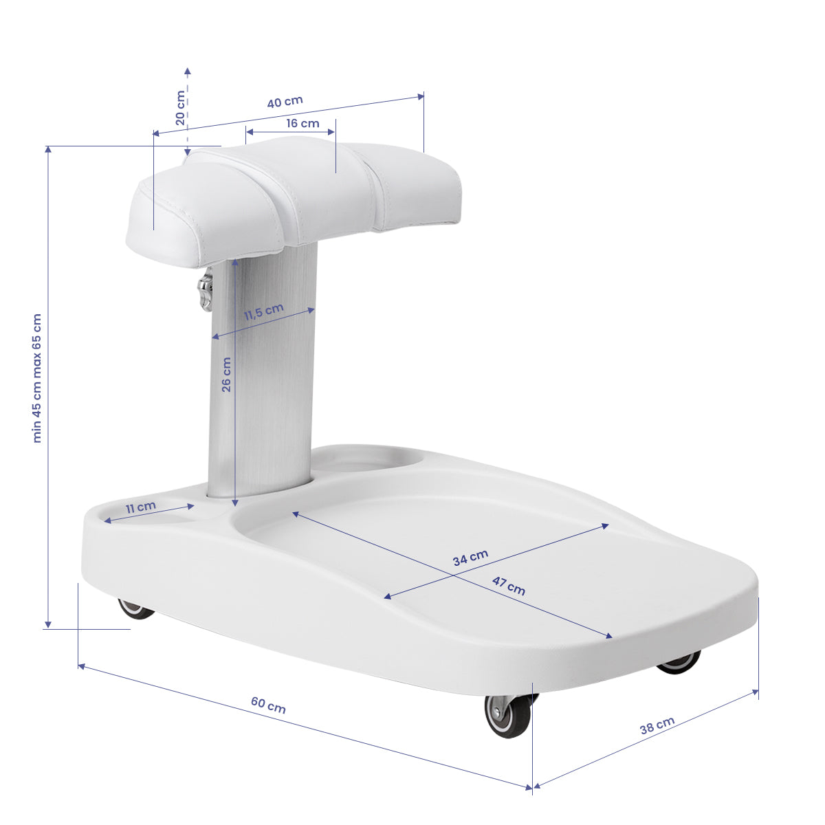 O apoio para os pés é composto por três partes, das quais a do meio é extensível. O ajuste manual da altura permite que seja erguido até um máximo de 20 cm. Todos os elementos do apoio para os pés são estofados com couro sintético, o que garante resistência à humidade e facilidade de limpeza. Como resultado, o carrinho pode ser ajustado às necessidades individuais do utilizador, o que o torna uma excelente solução tanto para tratamentos cosméticos como podológicos, assegurando conforto e precisão no trabalho em várias posições.