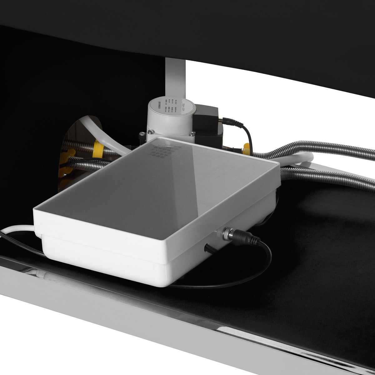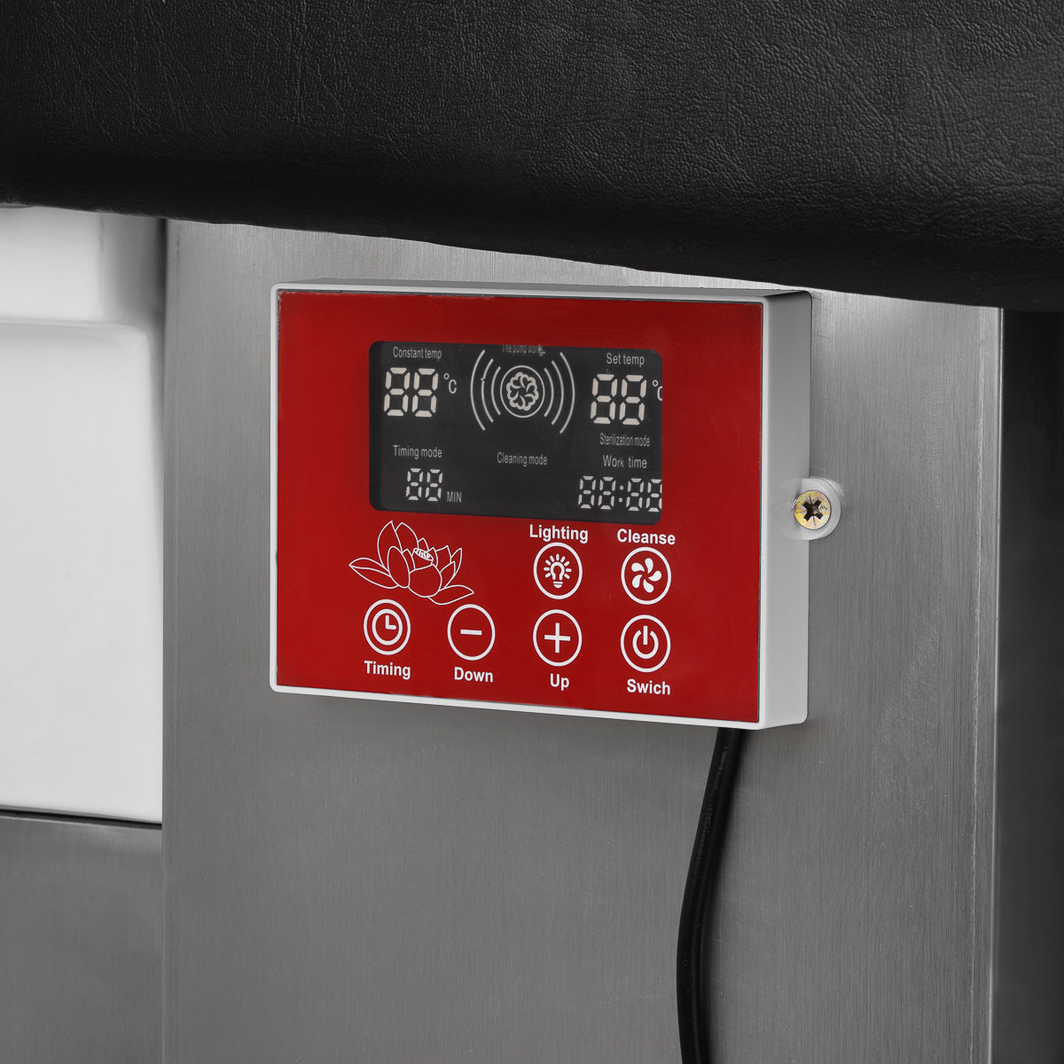 O painel tátil intuitivo oferece controlo total sobre as funções da unidade de lavagem. Permite ajustar o tempo de funcionamento e a temperatura da água, bem como monitorizar os seus valores atuais. Graças ao ecrã incorporado, pode verificar a qualquer momento há quanto tempo o dispositivo está em funcionamento. O painel também permite ativar a função de terapia de luz, ou seja, a iluminação da bacia, criando uma atmosfera de relaxamento e luxo. Além disso, o dispositivo de terapia a vapor está equipado com controlo remoto, permitindo uma operação conveniente à distância.