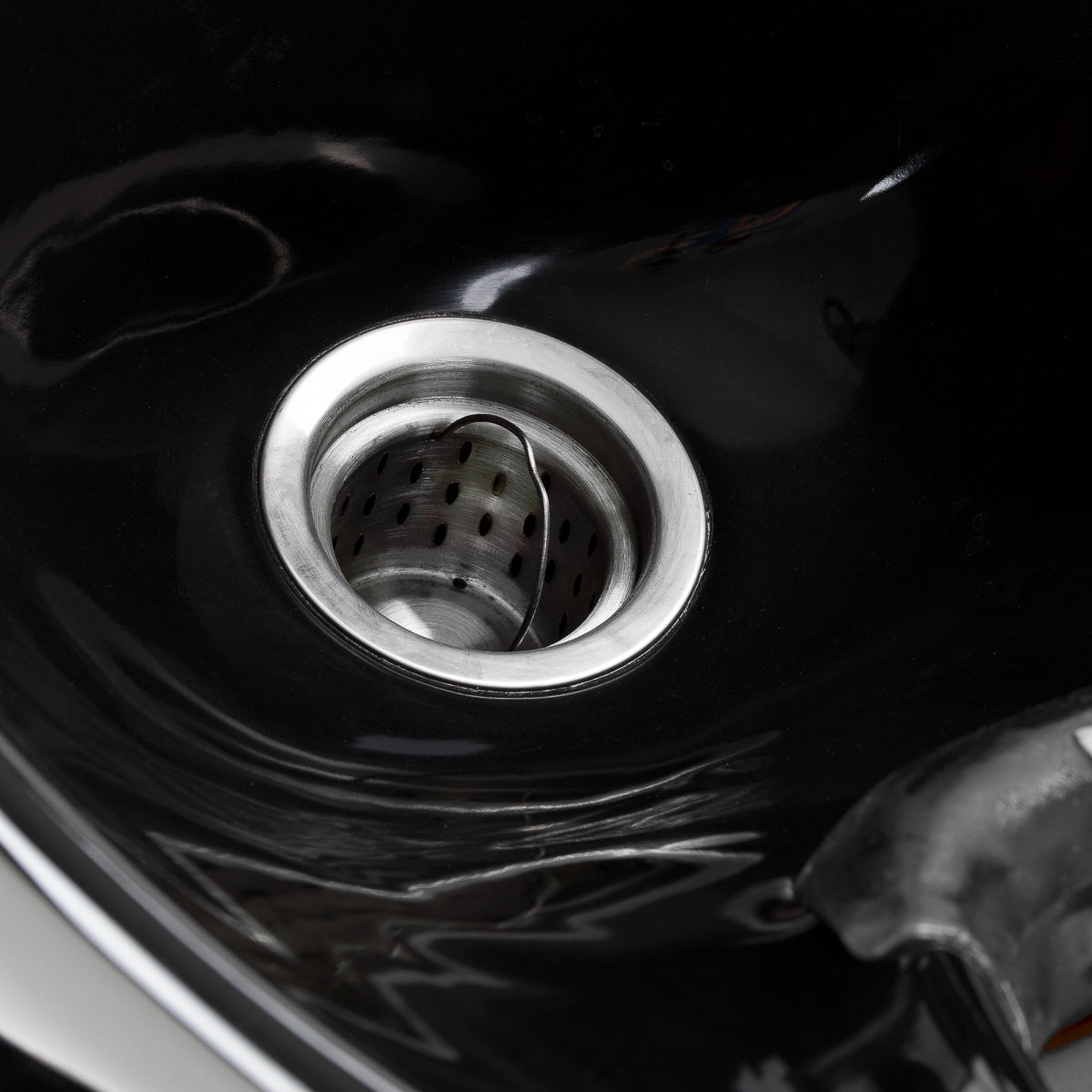 A cuba profunda em cerâmica em tons de preto minimiza os salpicos de água e cosméticos durante os tratamentos. O ângulo ajustável da cuba permite uma regulação precisa às necessidades do cliente. Fabricada em material duradouro, é resistente a descolorações, riscos e produtos químicos, e a sua superfície lisa facilita a limpeza. O apoio de cabeça ergonomicamente contornado oferece suporte confortável, e a cobertura em plástico preto elimina a sensação de frio ao contacto com a cerâmica.