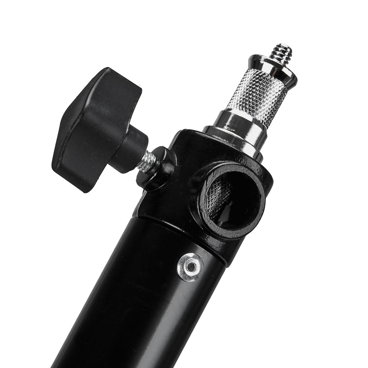 O design telescópico permite ajustar o comprimento do braço de 73 a 131 cm. Ajustar o ângulo do tripé proporciona uma liberdade significativa de movimento vertical e horizontal, permitindo direcionar a iluminação na direção selecionada com precisão. O pino de dupla face pode ser montado em um dos três orifícios, o que permite selecionar a configuração de iluminação adequada às suas necessidades.