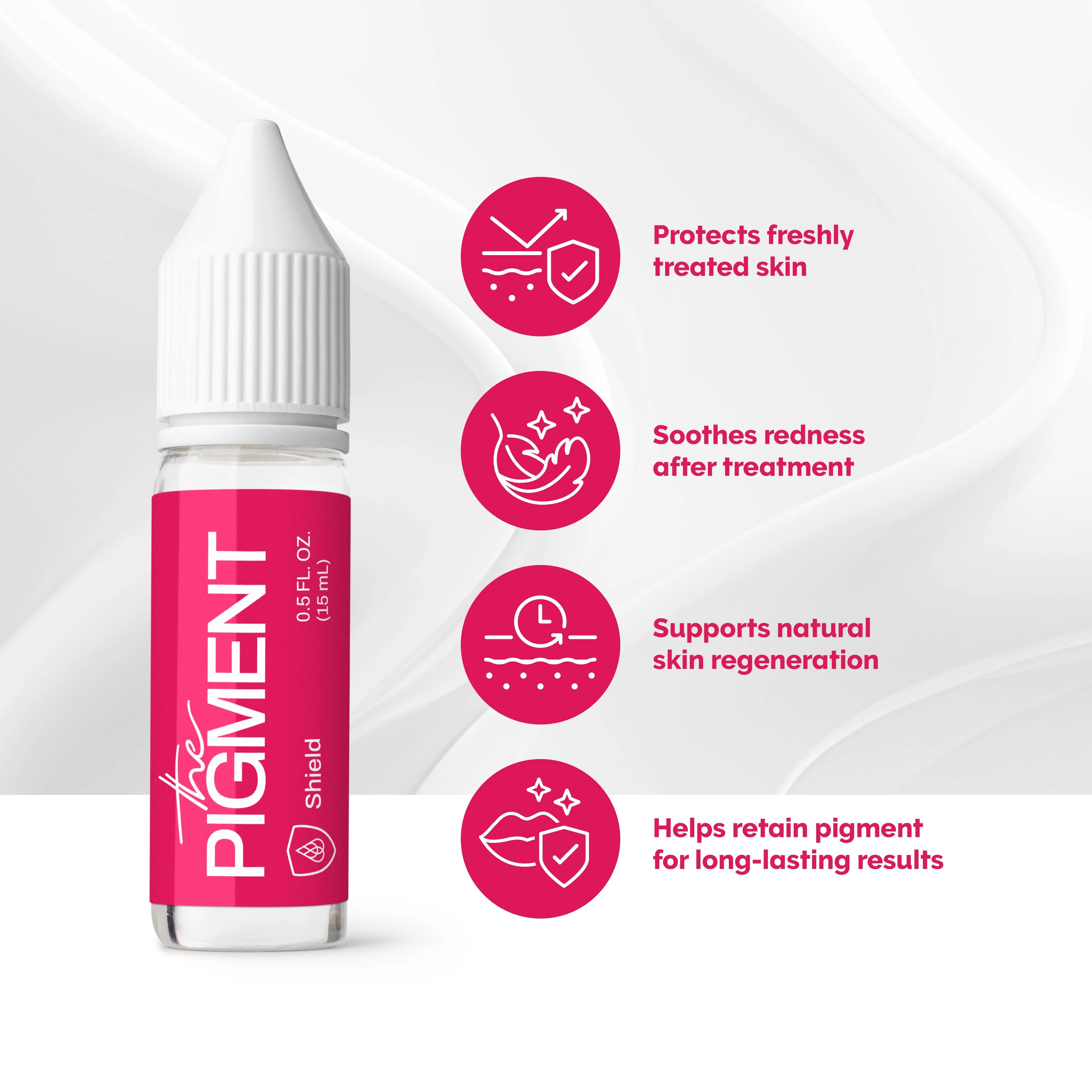 The Pigment Shield 15ml é especialmente formulado para cuidados pós-procedimento após PMU e microblading. A sua textura rica e transparente cria uma película protetora sobre a área tratada, protegendo o pigmento recém-implantado. A fórmula também ajuda a aliviar a vermelhidão e apoia o processo natural de regeneração da pele.