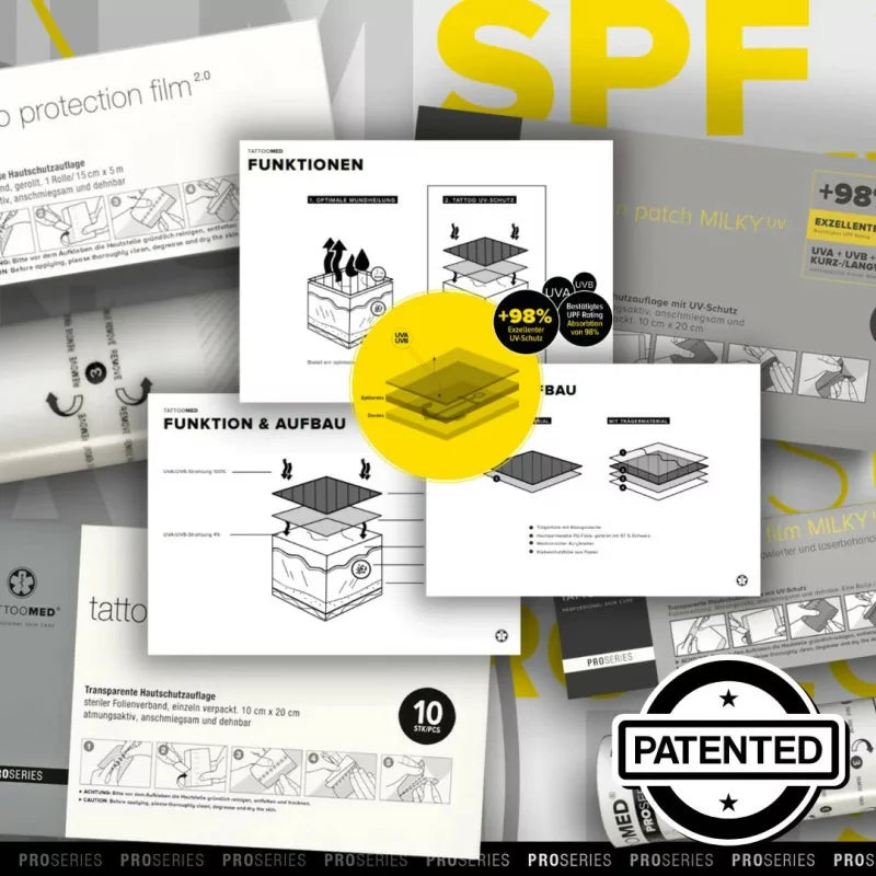 A pele recém-tatuada não tem a sua barreira natural de defesa, tornando-se altamente suscetível a queimaduras solares e danos celulares assim que sai do estúdio. O Filme de Proteção UV TattooMed MILKY atua como um escudo fiável, impedindo que a radiação UV nociva penetre na pele e apoiando a cicatrização ótima. O filme também protege contra contaminação, secura, germes e fricção têxtil, mantendo um ambiente húmido na ferida que acelera a regeneração e reduz cicatrizes.