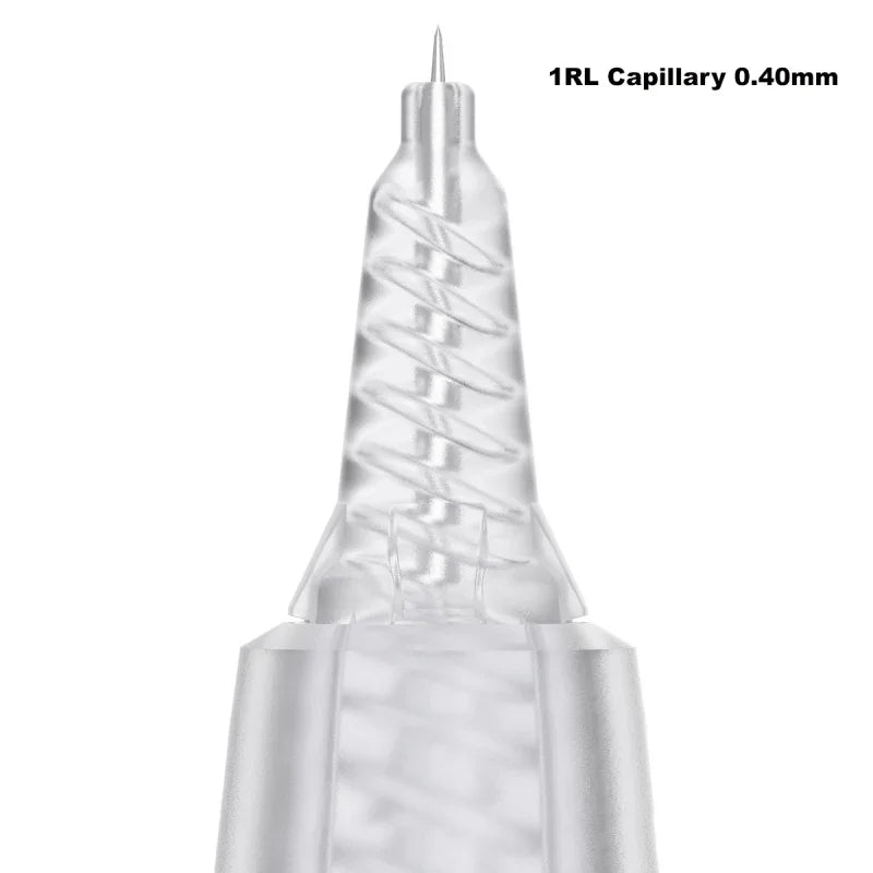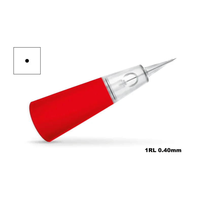• 1RL Nano (0,20mm): A agulha única mais fina, perfeita para cabelos filigranados, contornos de lábios e trabalho capilar na aréola.