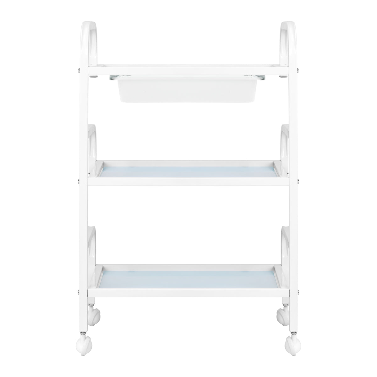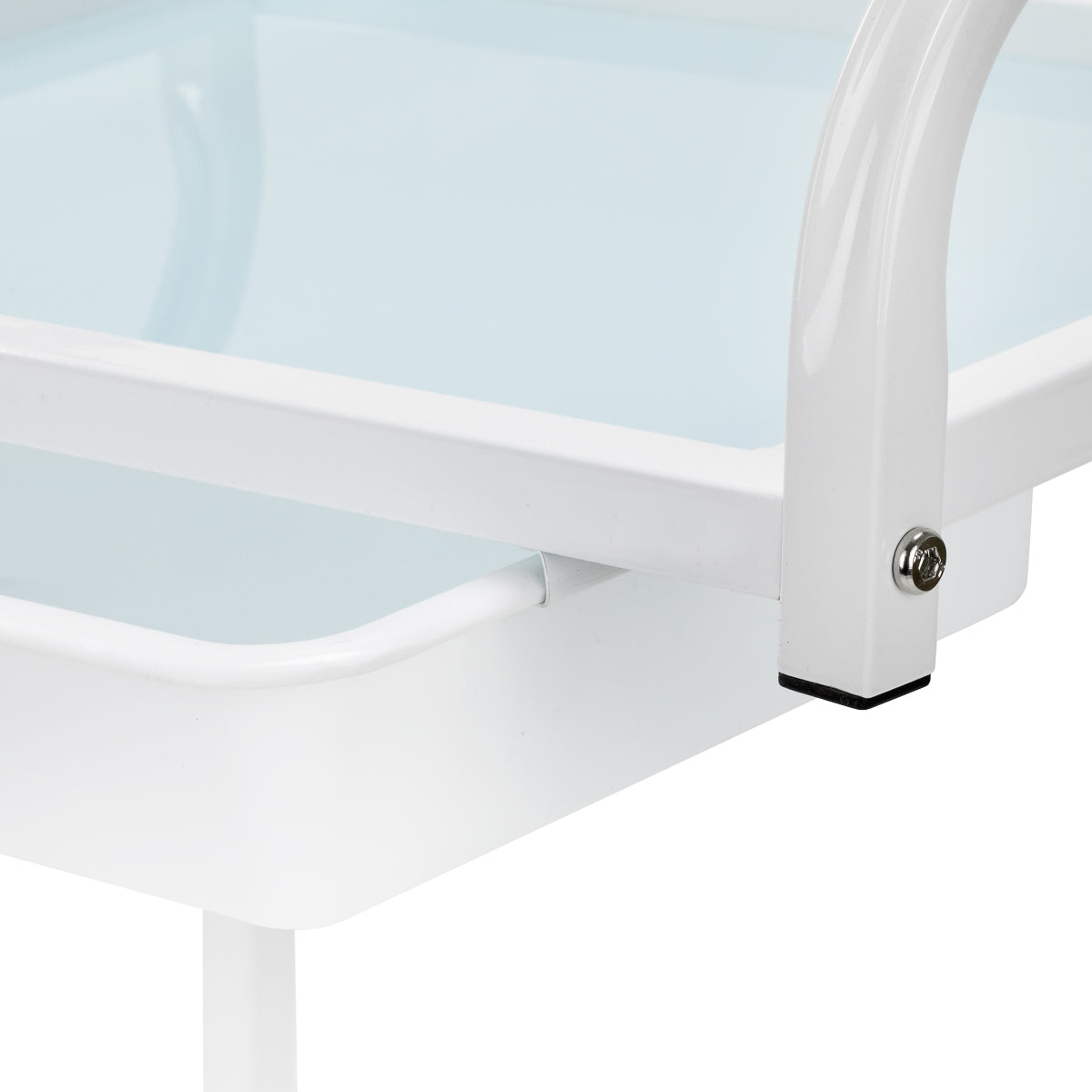 A estrutura feita de alumínio resistente em tons de branco e as prateleiras de vidro criam um conjunto moderno e estético que é fácil de manter limpo. Quatro rodas asseguram mobilidade para fácil organização do espaço de trabalho, enquanto materiais sólidos garantem estabilidade e durabilidade no uso.