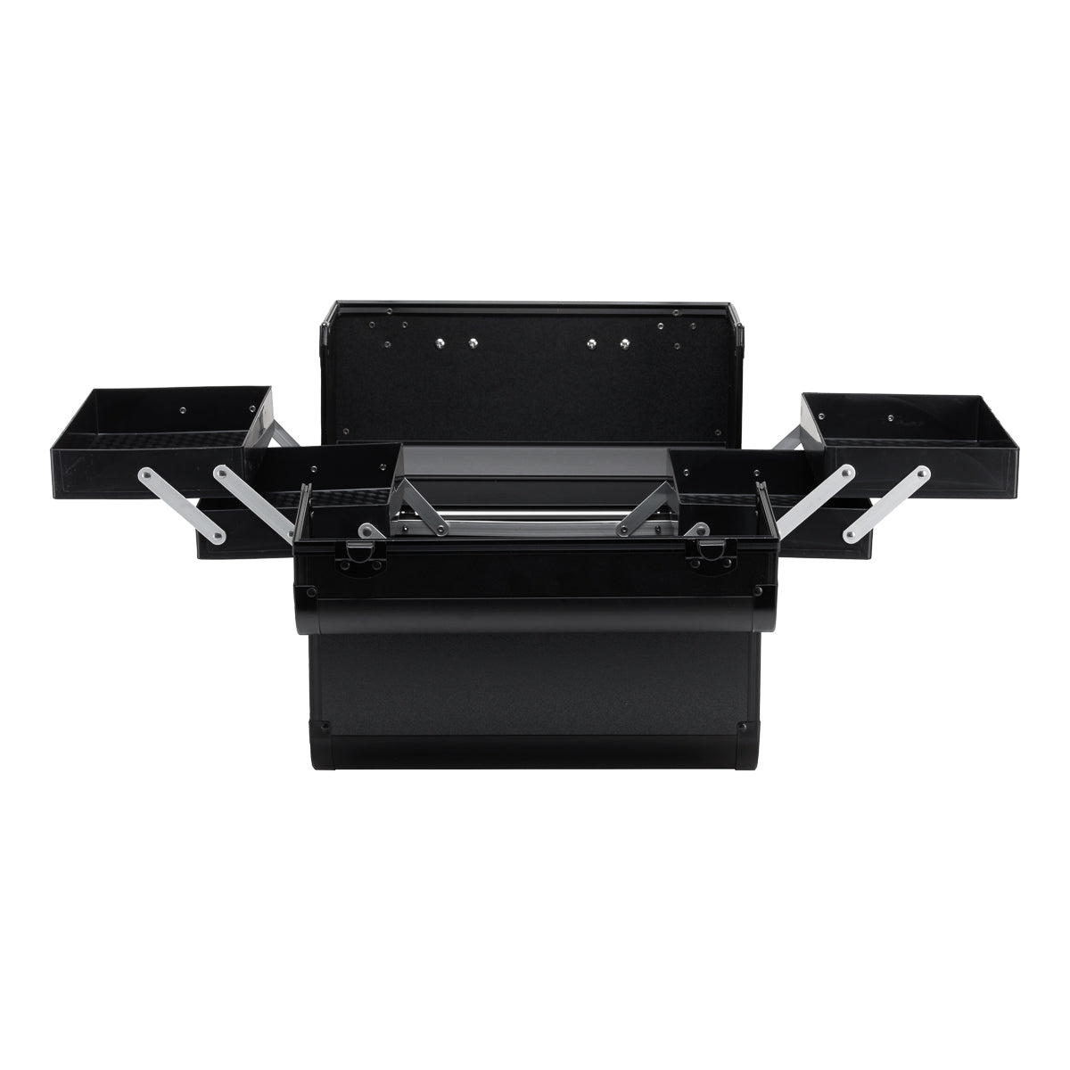 O design moderno com paredes lisas acabadas a preto e detalhes metálicos adiciona um toque de elegância. A alça facilita o transporte, o que é especialmente importante para estilistas móveis. Feita de materiais duráveis e resistentes a danos, garante conforto de uso diário. Um fecho robusto com chave mantém o conteúdo protegido, enquanto a estrutura leve e durável torna a mala fácil de transportar.