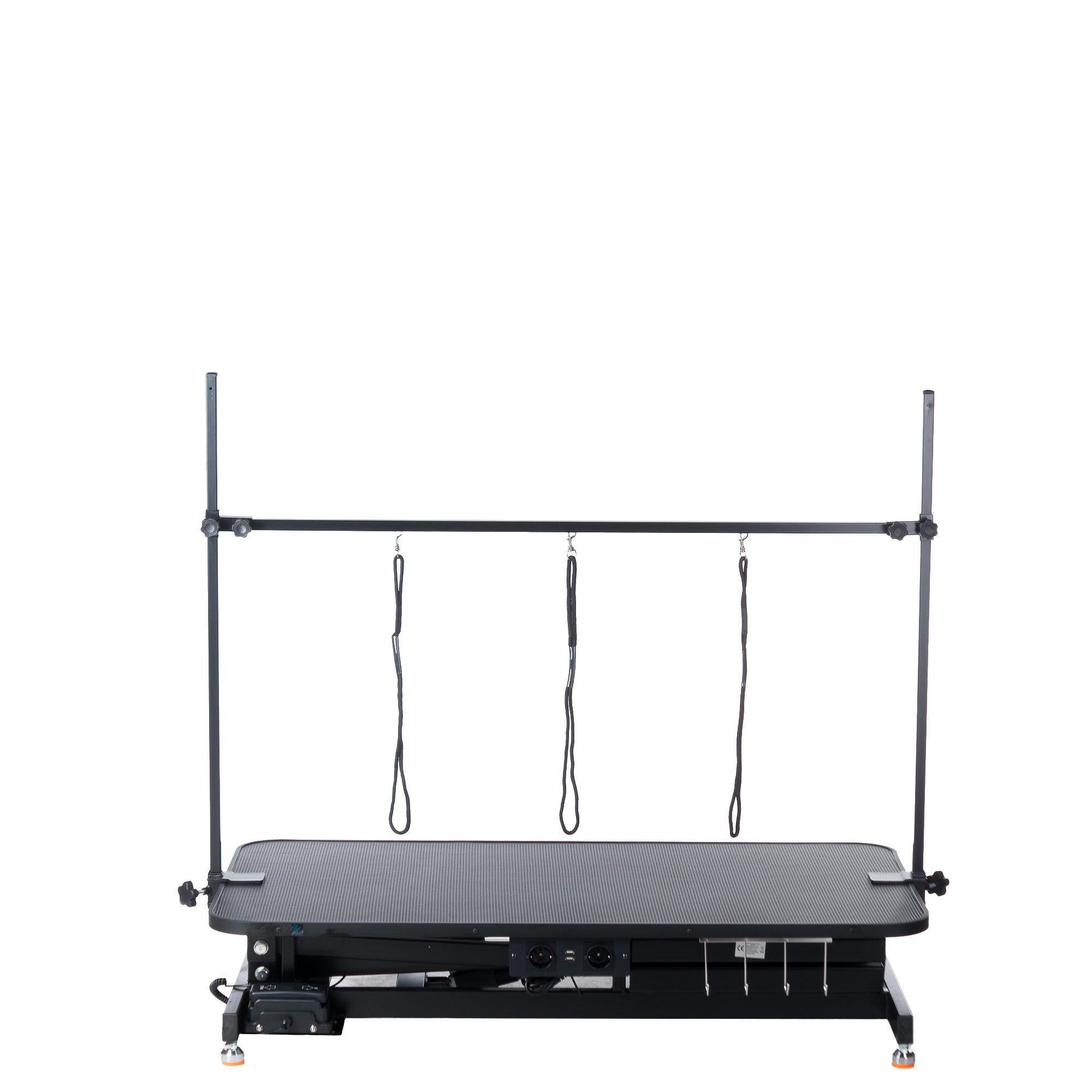Mesa de grooming para cuidados de animais de estimação em tamanho XL. Extremamente estável topo coberto com tapete antiderrapante preto. Estrutura em aço preta, pintada a pó. Altura do topo ajustável eletricamente, permitindo que a mesa seja adaptada exatamente às suas necessidades e ao tamanho do seu animal de estimação. Inclui barra transversal ajustável em altura com três trelas.