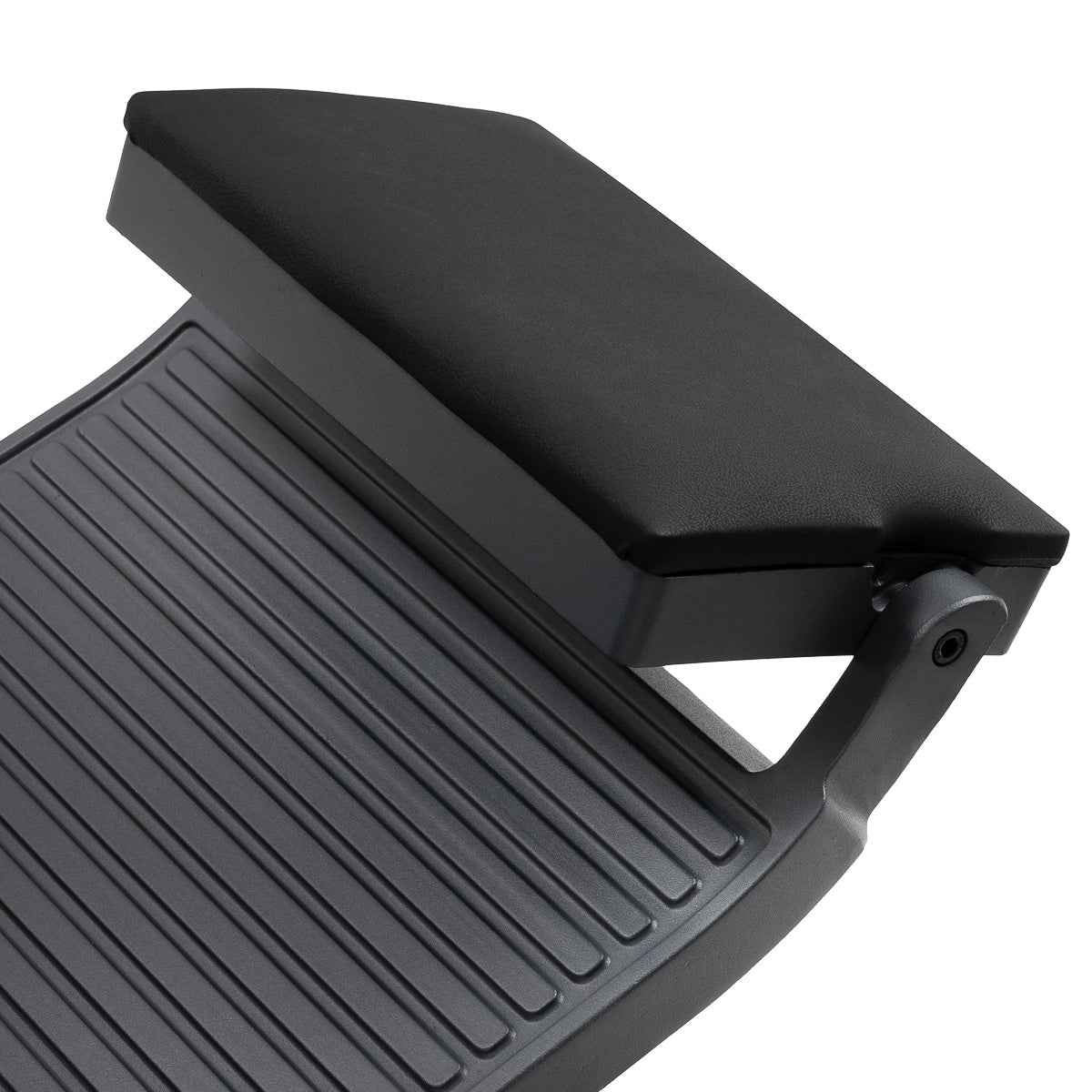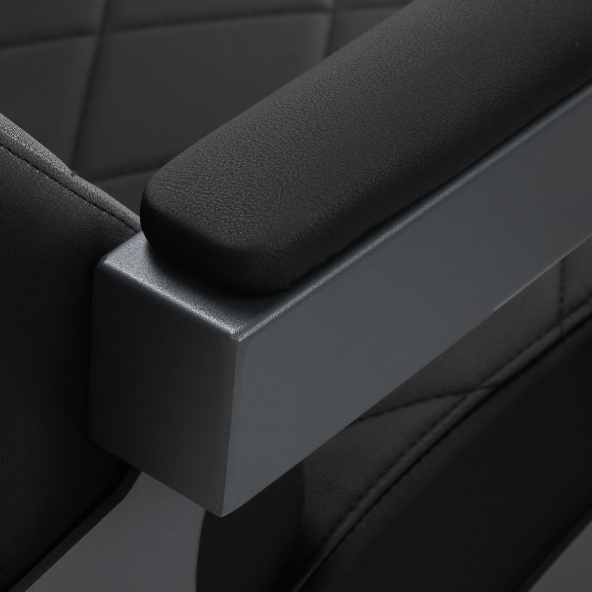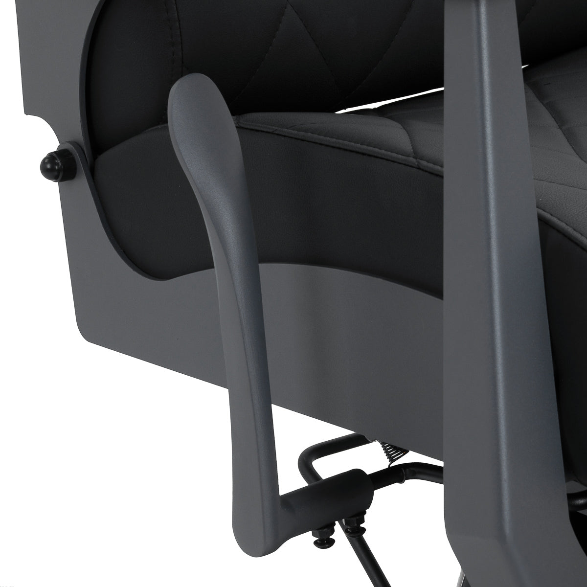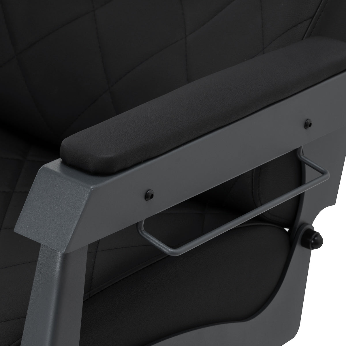 A construção estável garante segurança e durabilidade prolongada. O assento, preenchido com espuma resistente à deformação, e o estofamento em pele sintética macia asseguram durabilidade e conforto. Os materiais resistentes à humidade são não só duráveis como também fáceis de limpar. O estofamento preto combinado com a estrutura em grafite confere à cadeira um aspeto moderno e profissional, enquanto o seu estilo minimalista permite que se integre na decoração de qualquer barbearia.