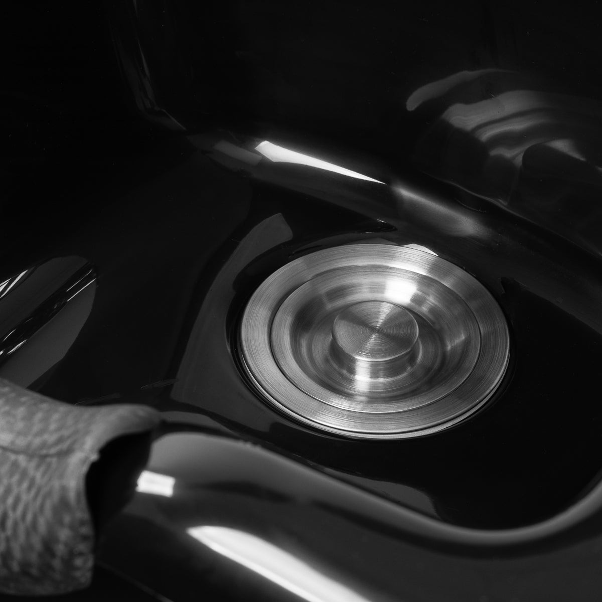 A tigela preta profunda é feita de plástico durável, o que a torna resistente a danos e fácil de manter limpa. O seu design bem pensado reduz eficazmente o salpico de água e de produtos durante a lavagem. A forma ergonómica e a gola perfilada com cobertura de silicone proporcionam ao cliente uma posição confortável para a cabeça. Um local prático para o chuveiro de mão ajuda a organizar melhor a estação, e o tampão com filtro facilita o controlo do fluxo de água e a manutenção da limpeza e higiene.