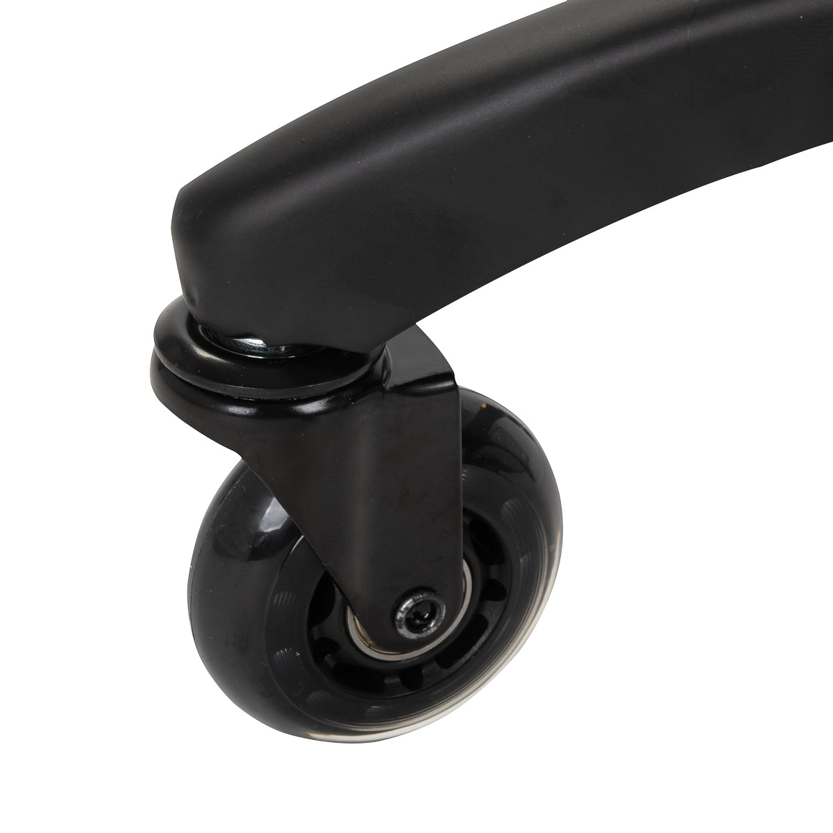 O ajuste da altura do assento varia de 56 a 76 cm, permitindo uma posição personalizada às necessidades individuais do profissional durante a prestação de serviços. O encosto apoia a coluna vertebral, garantindo conforto mesmo durante trabalho prolongado. O mecanismo de rotação completa aumenta a liberdade de movimento, resultando em maior conforto e eficiência. A mobilidade é assegurada por rodas Roll Speed com núcleo de ferro e revestimento em poliuretano (PU), que combinam movimento suave com resistência excecional ao desgaste. O uso de rolamentos ABEC-7 torna o banco fácil de mover, facilitando significativamente a manobrabilidade.