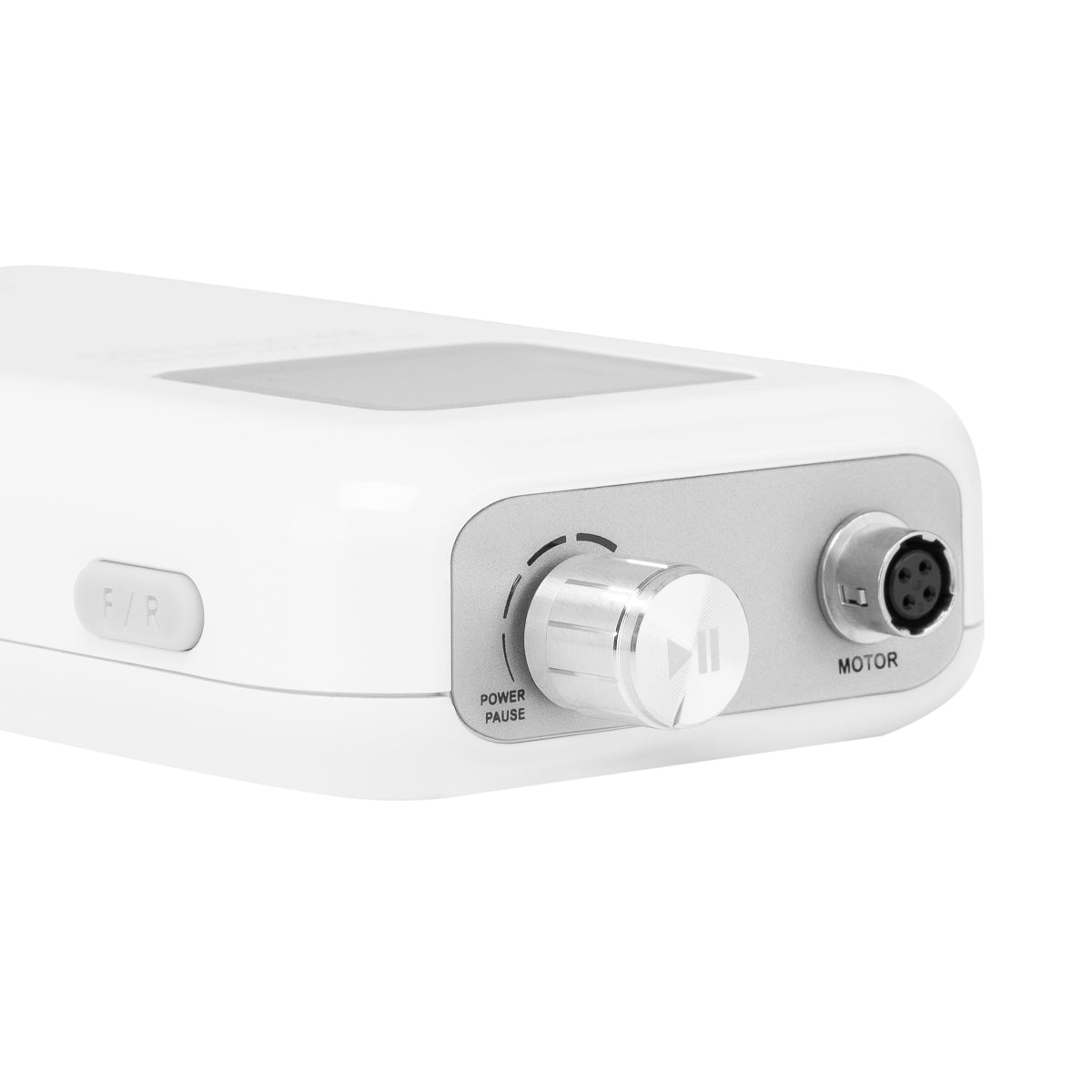 O botão permite o ajuste suave da velocidade da cabeça, alcançando até 35.000 rotações por minuto, permitindo fácil personalização e conforto durante diferentes tratamentos. Premir o botão permite parar e retomar imediatamente o dispositivo (função pausa), o que dá controlo total sobre o fluxo de trabalho. Botões práticos localizados nas laterais permitem mudança rápida para o acionamento por pedal e alteração da direção de rotação, facilitando ainda mais a adaptação do dispositivo a vários serviços. O ecrã mostra informações sobre a direção de rotação, estado da bateria, ativação do acionamento por pedal e pausa ativa. Além disso, o dispositivo está equipado com proteção contra sobrecarga, que protege o motor contra sobreaquecimento, garantindo maior segurança no trabalho e longevidade do equipamento.