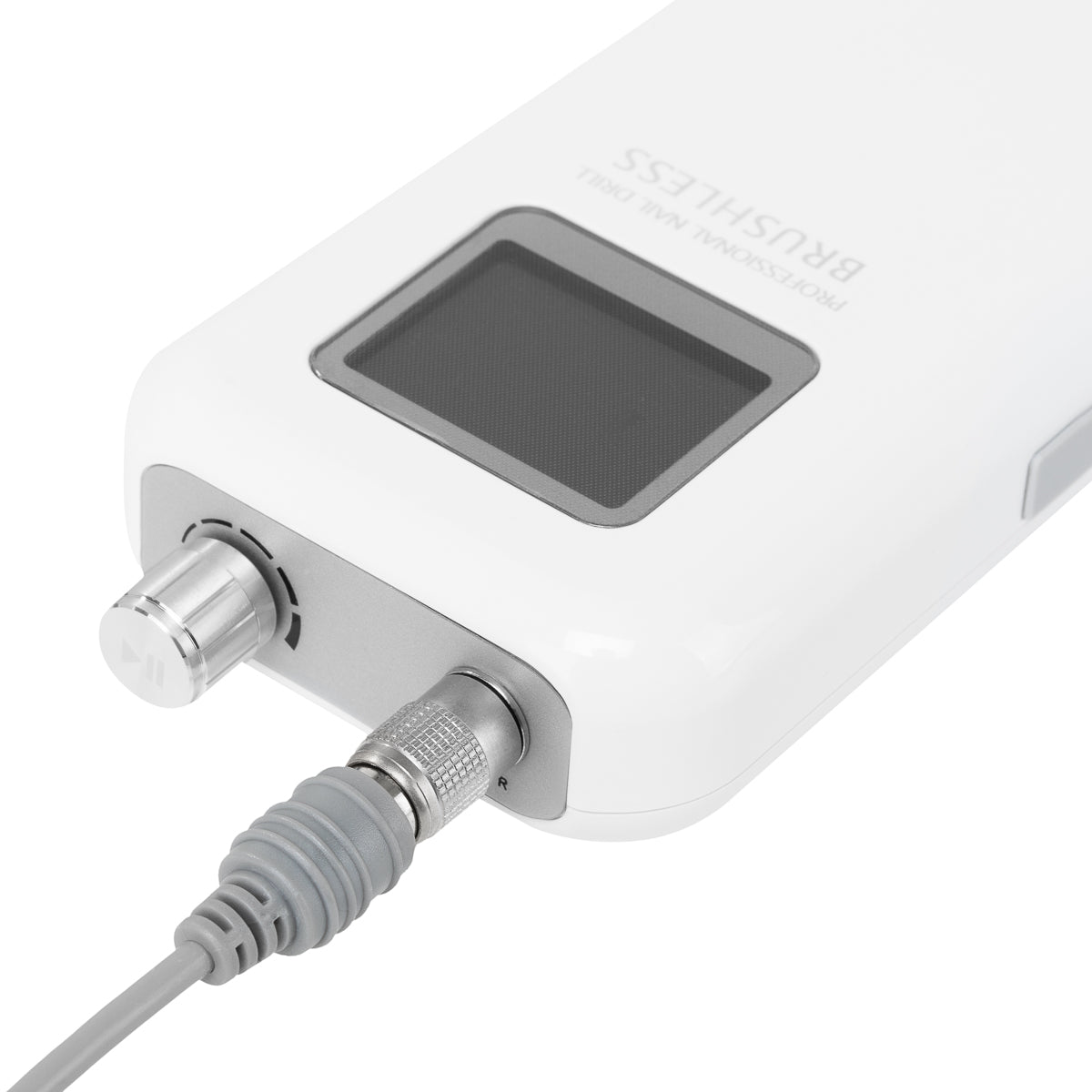 A broca para unhas funciona silenciosamente, eliminando ruídos irritantes e proporcionando conforto tanto para quem realiza o tratamento como para os clientes. A bateria integrada de 2850 mAh permite trabalhar até 8 horas com uma única carga. Além disso, o dispositivo possui um modo automático de poupança de energia, que evita a descarga da bateria. Adicionalmente, o dispositivo foi desenhado com ergonomia em mente – a disposição conveniente dos botões e a operação intuitiva fazem com que cada tratamento decorra sem problemas.
